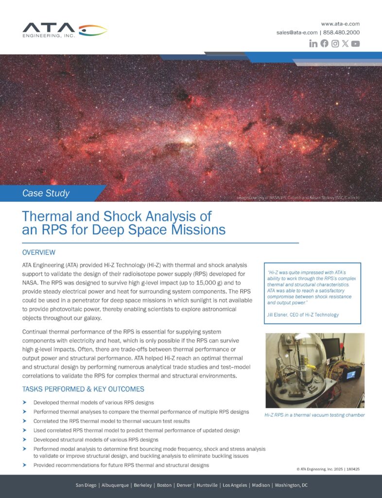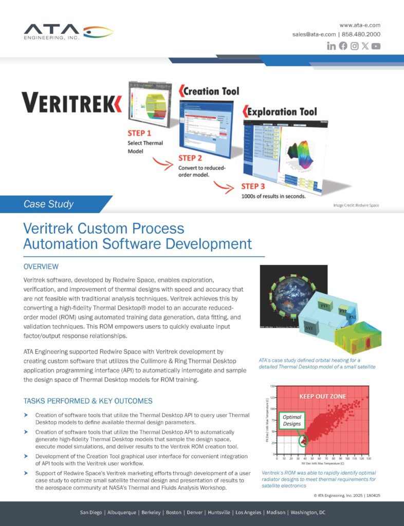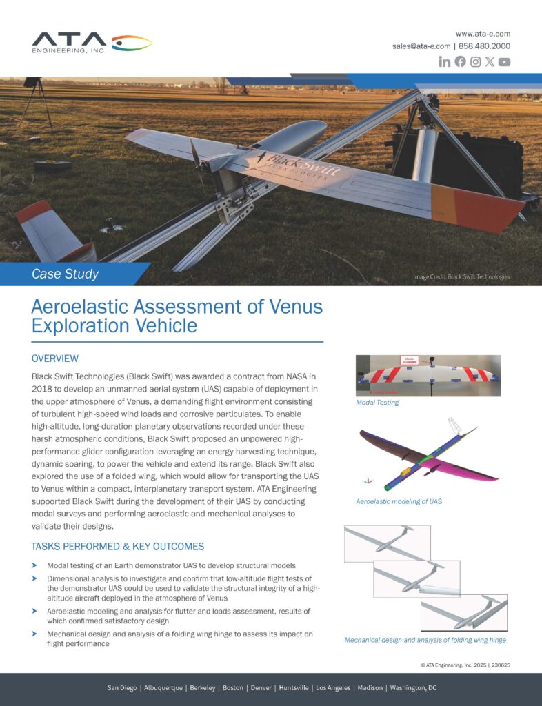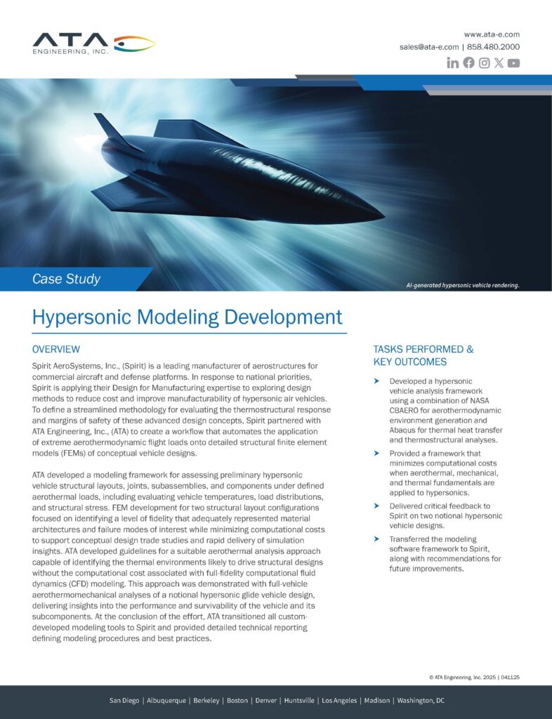 full Insights Case Studies CLIENT USE CASES OF ATA ENGINEERING SERVICES ATA has a number of case studies detailing the successful engineering projects on which weโve collaborated with clients. Browse the case studies below for examples of our breadth of skills and knowledge. full Supporting Engine Test Cell Development by Modeling High-Speed Jet Exhaust Noise and Its Impact on Facility Structural Integrity Download ยป Hypersonic Modeling Development Download ยป Ground Vibration Test of Eight-Rotor eVTOL Aircraft Download ยป Analysis, Test, and Software Support for Repeatable Launch Vehicle Performance Download ยป Aeroelastic Assessment of Venus Exploration Vehicle Download ยป SRAM Download ยป Trek Bicycle Download ยป Sculpture Stress Analysis and Design Support Download ยป Thermal and Shock Analysis of an RPS for Deep Space Missions Download ยป Hospital Campus Wind Mitigation CFD Analysis Download ยป Veritrek Custom Process Automation Software Development Download ยป Human Landing System Engineering Support Download ยป Page 1 of 41234» full LAUNCH YOUR VISION Connect with us to discuss how our advanced multi-disciplinary team can help you achieve your engineering goals. First Name*(Required)Last Name*(Required)Company*(Required)Email*(Required) Phone Number*(Required)Job Title*(Required)Message*(Required)Privacy Policy(Required) I agree to have my information stored Privacy Policy.* Δ